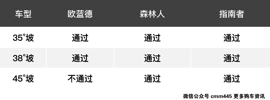 其实在上38°坡的时候,欧蓝德就已经有点勉强,面对45°坡更是直接歇菜。在45°坡上,指南者最为从容,动力分配得很不错,而森林人表现得也有点勉强。