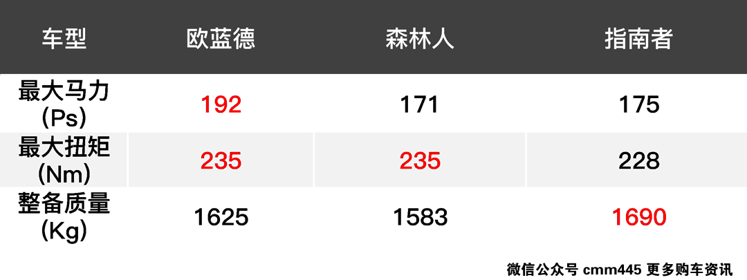 可以看到在动力数据上,欧蓝德有较为明显的优势,不过整备质量还是偏重了一点。指南者不仅动力不占优势,质量还是三者中最重的,按理说在越野时会比较吃亏,但事实又并不是这么简单。