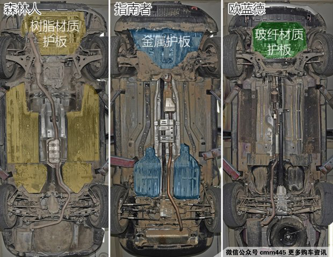 从底盘护板来看,森林人的保护面积最广;而指南者虽然覆盖面积没有那么广,但发动机和油箱这两个重要地方都很好地保护到;欧蓝德则没有对油箱进行保护,有磕穿油箱的风险。
