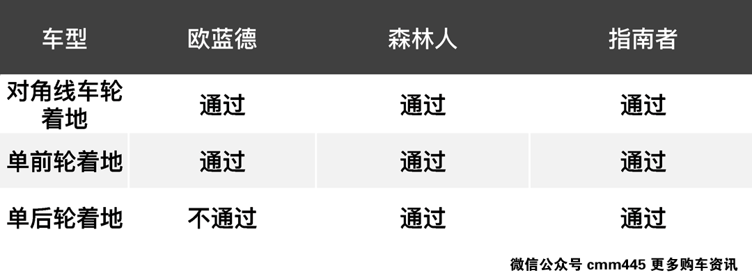 从实际的测试也可以看出,森林人和指南者的轮间限滑能力都不错,不过指南者的反应会更为迅速一些。欧蓝德由于没有后桥差速器锁止装置,且电子限滑机构的反应亦不够及时,所以不能通过单后轮着地的测试。