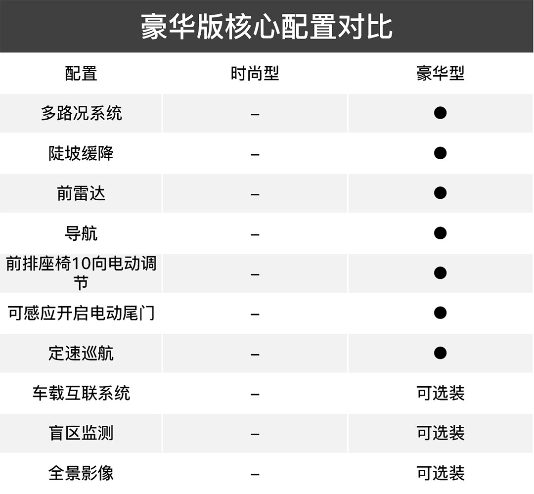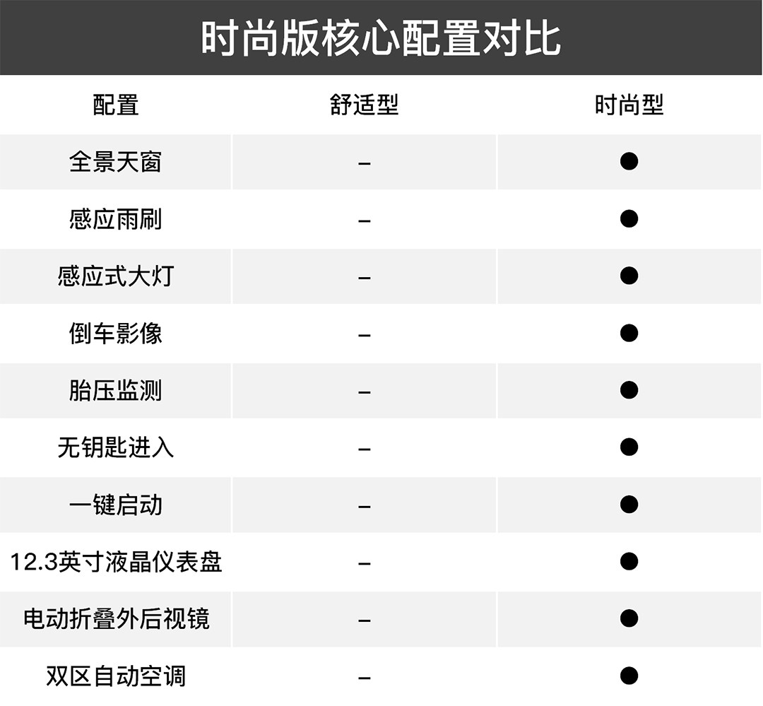 而相对于更高一个梯度的时尚型来说,会配备有全景天窗、感应式大灯、感应雨刷、倒车影像、胎压监测、无钥匙进入、一键启动、12.3英寸液晶仪表盘、电动折叠外后视镜、双区自动空调等一系列实用性配置。