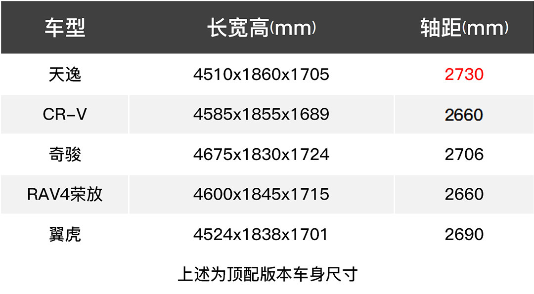 而天逸的长宽高分别为:4510*1860*1705mm,在轴距方面为2730mm,也是同级当中轴距最长的车型。而它的竞品车型也是当下主流的合资紧凑型SUV:福特翼虎、本田CR-V、日产奇骏、丰田RAV4、大众途观等一系列的选手。相比之下,虽然天逸的造型设计很带感,但在外观尺寸方面表现则显得中规中矩。