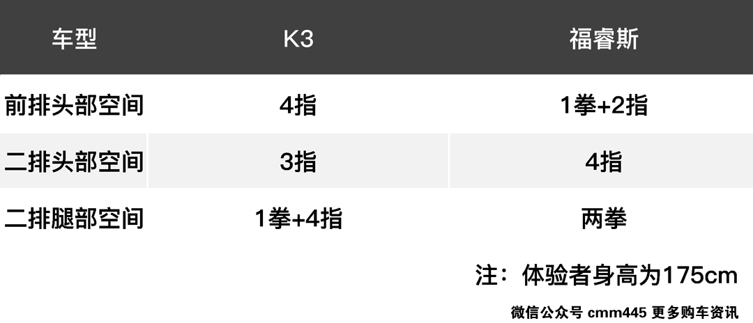 由上表可以看到,福睿斯在车内空间上明显比K3要更好,只有在二排头部空间上,两者才不相伯仲。两款车型即便去到顶配依旧没有中央头枕,这点要提出批评。两者就二排中央地板的隆起而言,都不算太高。