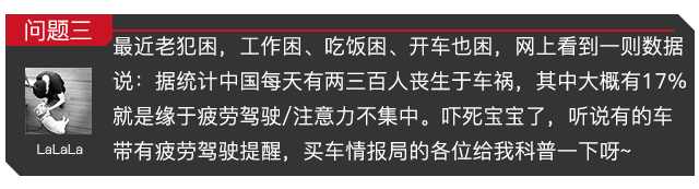 点评:通过对驾驶员脸部进行识别、对外部车道前车行人进行检测啊,通过驾驶员转向操作频率以及转向动作,或者行驶时间、转向灯的使用情况这些条件来判断驾驶员是否疲劳,嗯看起来确实很高大上,但是阿宅觉得其实用性还是一般般啦,当然它有发挥作用的时候,但是安全行车好习惯主要还是得靠驾驶员自己养成。