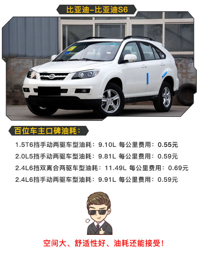 对于比亚迪S6来说,也能称得上在国产SUV征战多年的一位老将,以其庞大的车身、良好的舒适性、不错的车内乘坐空间获得不错的口碑。而在油耗方面,双离合的车型油耗不够理想,但是如果对于手动挡车型驾驶并不够熟悉的时候,还是能够选择这一个版本。但是更能勤俭节约地过养车生活还是推荐2.4L6挡手动的车型。