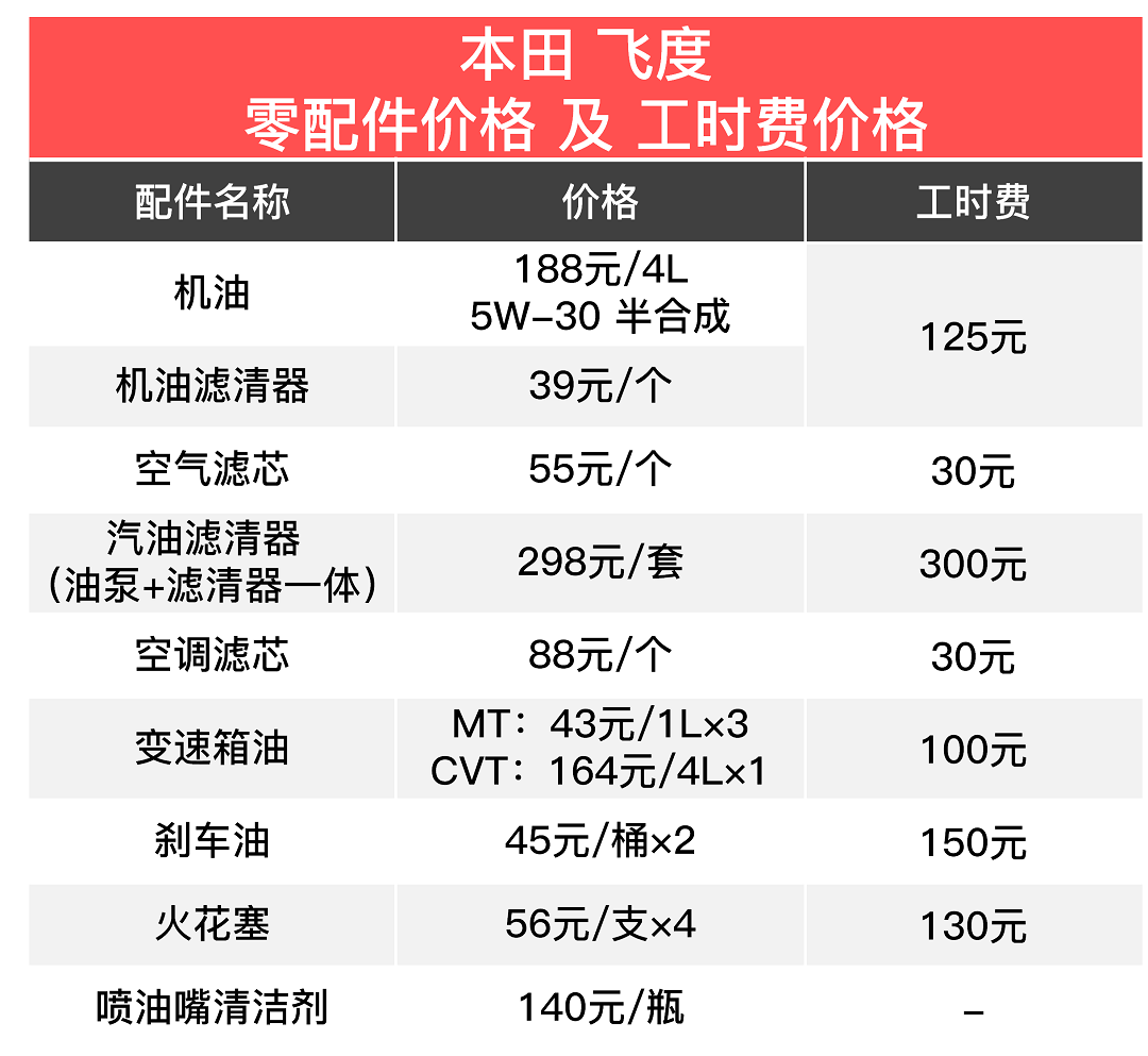 飞度的原厂机油有5W-30半合成机油和5W-40全合成机油,价格分别为188元/4升和388元/4升,本文仅统计5W-30半合成机油。