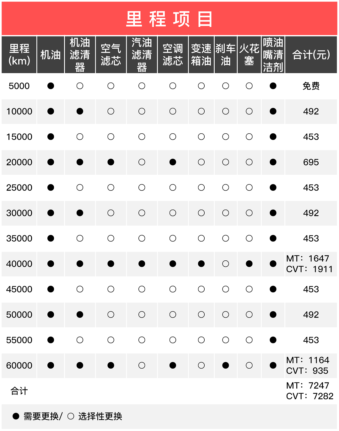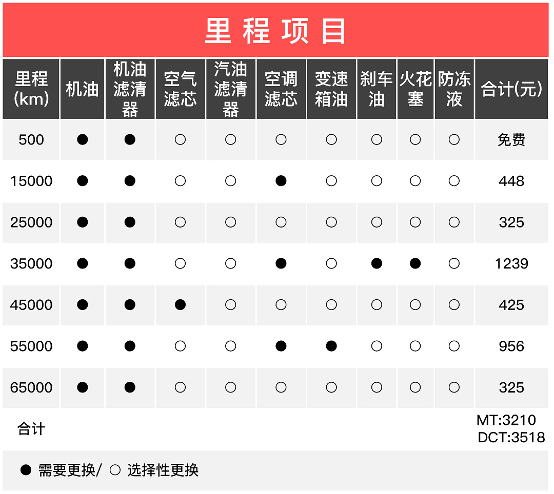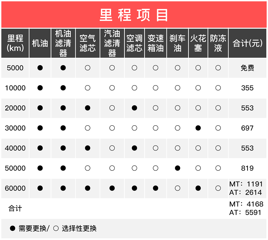 本文仅计算官方建议保养周期,保养间隔为1万公里,出于实际用车情况,一些4S店会建议5千公里一保养,大家可根据实际情况而定;而在自动挡车型5万5公里需要更换变速箱油,所以最后价格会比手动挡高一点。
