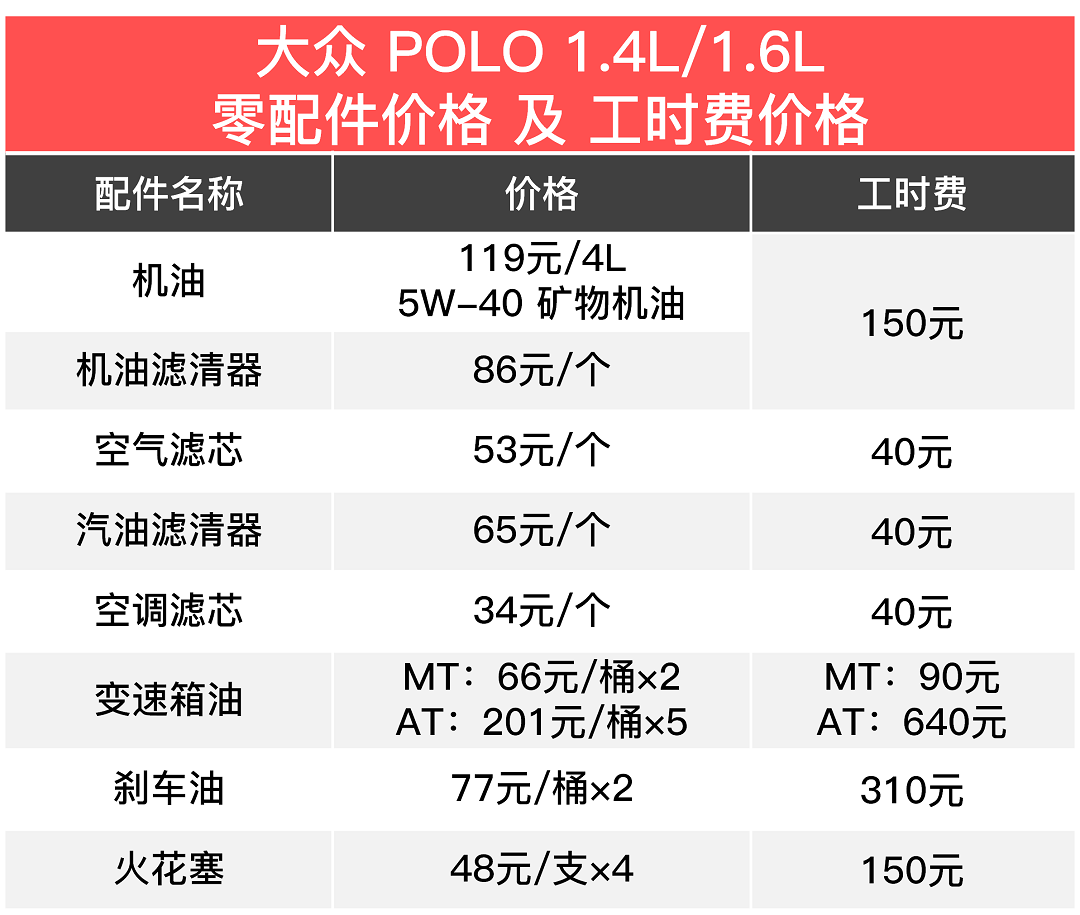 大众为POLO提供了原厂矿物质机油119元/桶/4L和原厂半合成机油288元/桶/4L,本文仅统计矿物机油价格;同时可以看出自动变速箱的价格略贵,但是6万公里一换,可以接受。