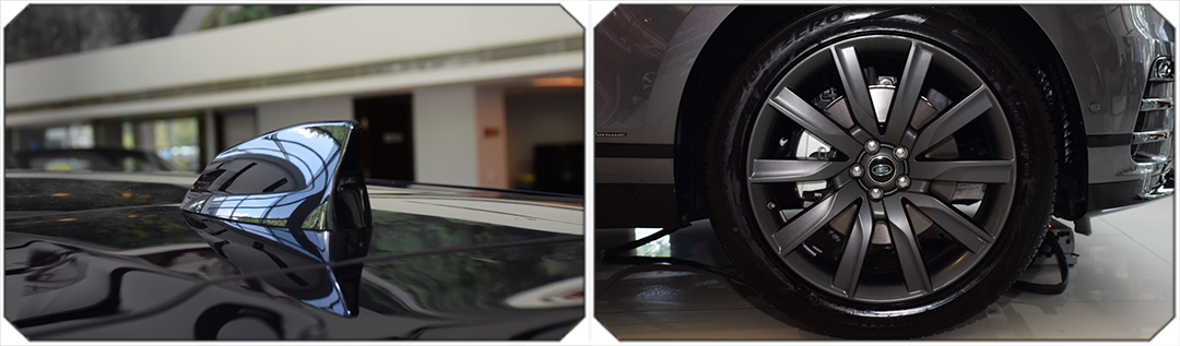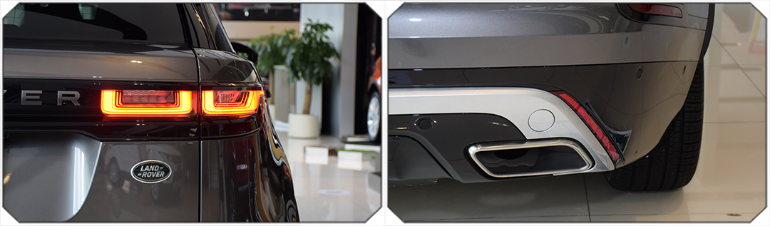 再来到车身后方,由于D柱倾斜角度较大使得车尾特别性感迷人,看上去比一般的中型SUV更大更动感。令人耳目一新的还有首次出现在揽胜车系里面的横状型尾灯,视觉效果很强烈,尾部排气造型也是运动感十足。