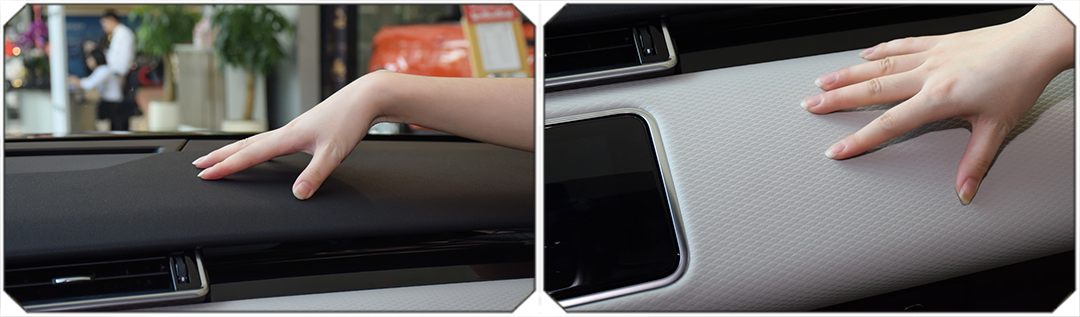 中控台上方覆盖的材料虽然柔软度不是那么高,但是颗粒感很明显、质感不错。中间白色部分摸起来十分舒服,但可惜这款车型用的不是真皮。