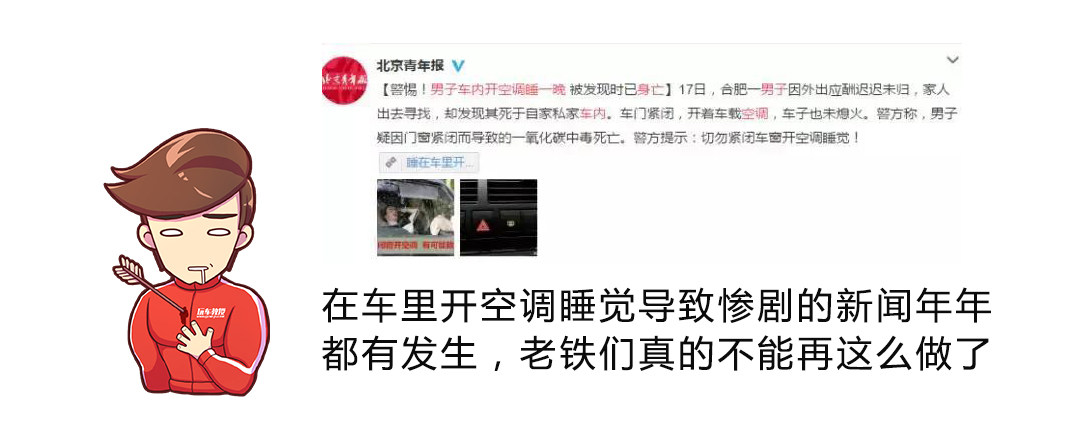 不少车主长途驾驶或者在外办事需要休息,直接在车里开着空调就睡觉,且不说怠速开空调是非常耗油的,在这里开空调睡觉其实是很危险的。