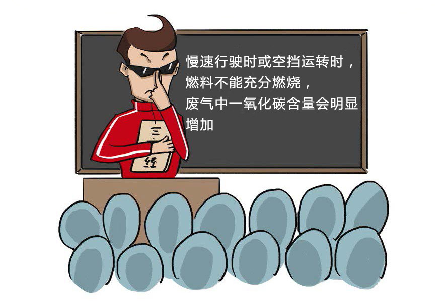 因为发动机怠速工作,气缸中的汽油燃烧不完全就会产生高浓度一氧化碳排放在汽车周围,时间越长浓度越高,周围是密闭环境(地下停车场、巷子)的话空气流通不畅,积累汽车周围的一氧化碳就会更多,