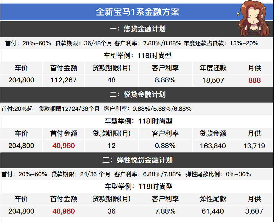 宝马官方现在针对全新1系推出三种金融方案,以售价20.48万的118i时尚型为例,首付11万左右,48个月的贷款期限,月供最低只需888元。