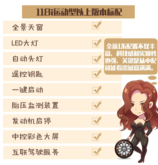 全新1系更吸引人的在于十分丰富的配置。以118i运动型为例,配备热门的全景天窗、LED大灯、遥控钥匙、一键启动、行车电脑显示屏、电子手刹、中控多媒体大屏。全系标配互联驾驶服务系统,可实现一键紧急救援和通过手机APP享受出行、售后等来自宝马官方的高品质服务。