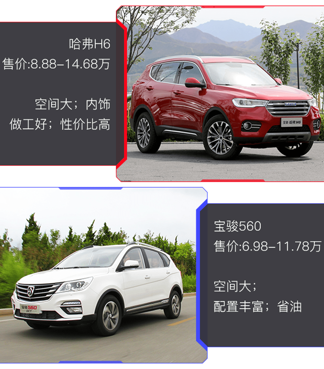 既然对动力、油耗有要求,那干嘛还紧紧抱着哈弗H6不放?来看看宝骏560啊!空间大、配置丰富,乘坐质感也不错,价格还会更便宜一些。以前老是嫌弃人家只有AMT变速箱,现在DCT车型已经推出了,换挡时的表现还平顺,你真的不去看看吗?