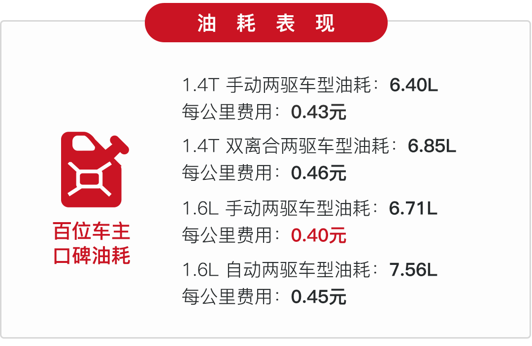 1.6L车型采用的是铁制缸体,质量更重,同时发动机的供油方式为多点电喷,在燃烧效率上就不如直喷高,这也导致了它的油耗偏高一点点。令人惊喜的是1.6T车型的油耗仅比1.6L高一点点而已,但动力提升确实显著。