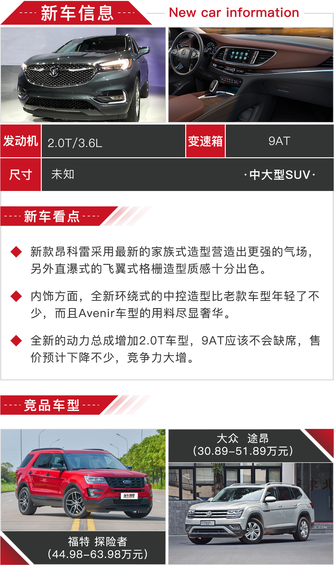 老款昂科雷由于仅搭载3.6L发动机,因此需要承担不少的关税。新款昂科雷除了会搭载一台全新的3.6L V6发动机,最大马力可以达到377Ps,其次新款还增加了一台2.0T涡轮增压发动机,最大马力可达292Ps,与其匹配的变速箱很有可能是目前通用旗下的最新的9AT变速箱。小排量涡轮发动机的加入,就算昂科雷一开始采用进口方式引入,价格也将会有明显下降。后期引入国产之后,免去了一系列的关税与运输成本,昂科雷的竞争力将会大大提升。