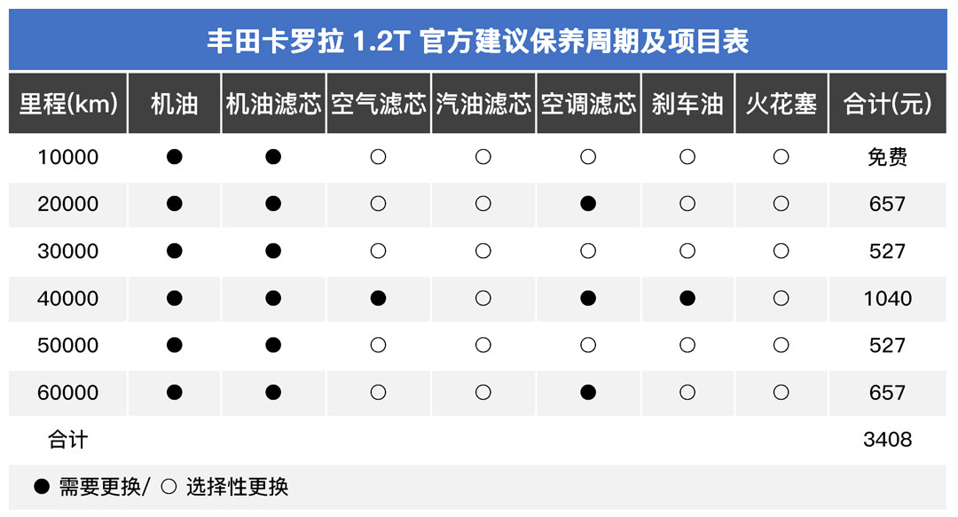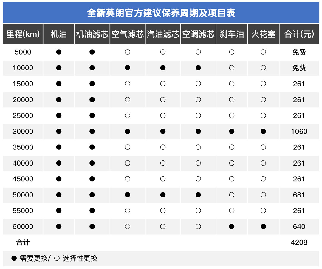 从上表中其实不难看出,卡罗拉的保养周期在每一万公里一保,英朗则为每五千公里一次保养,从里程的间隔上卡罗拉相比英朗要长上不少。并且卡罗拉6万公里内并没有换火花塞的要求,而英朗则需要每30000公里时更换火花塞。