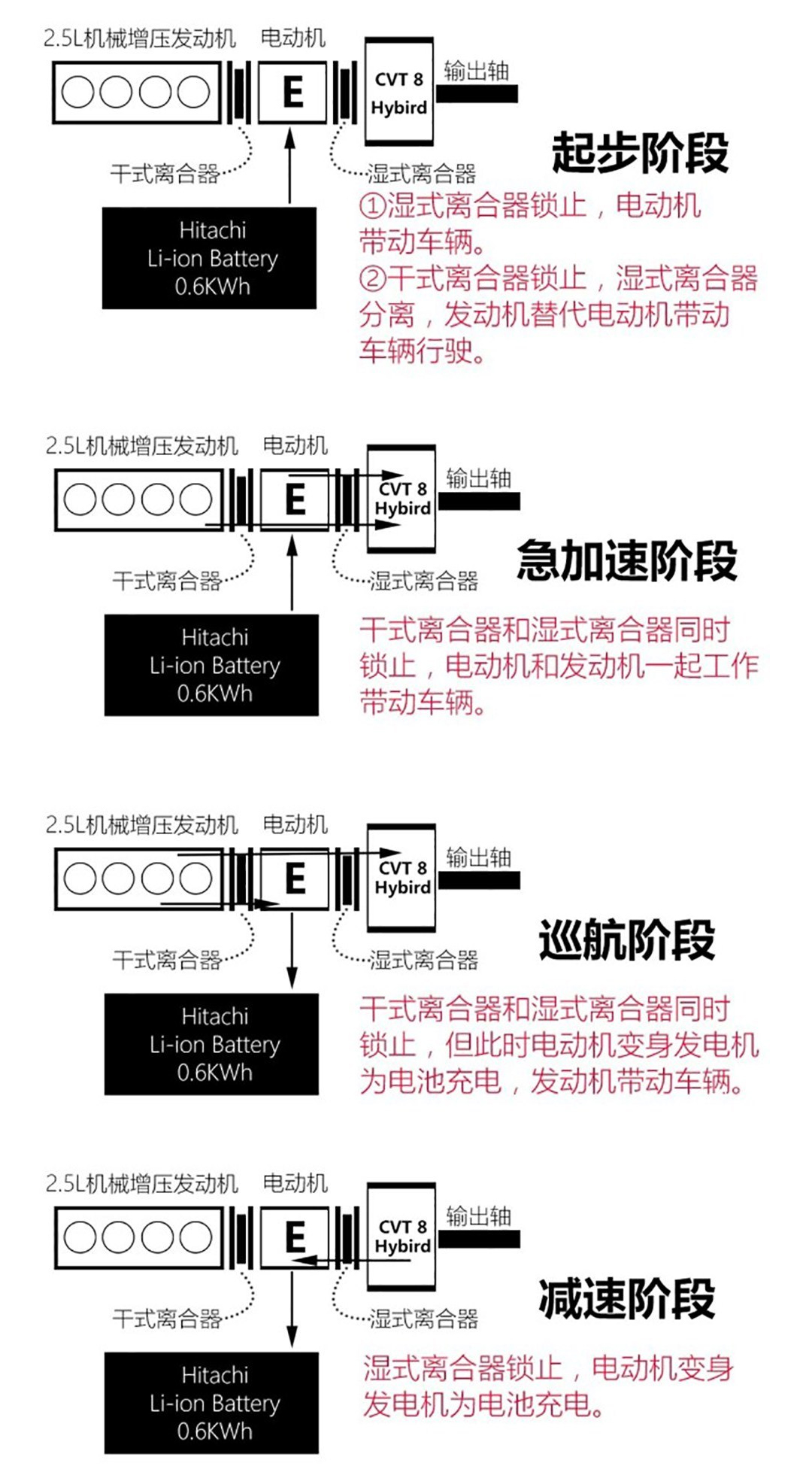 这样的好处在于在起步阶段,离合先接合湿式离合器再干式,用电动机把车先带起来,随后发动机再介入,一方面可以做到0转速起步(平顺得不要不要的),另一方面没有任何起步震动,自动启停随便工作,两套离合器几乎涵盖了所有混动所需的控制。