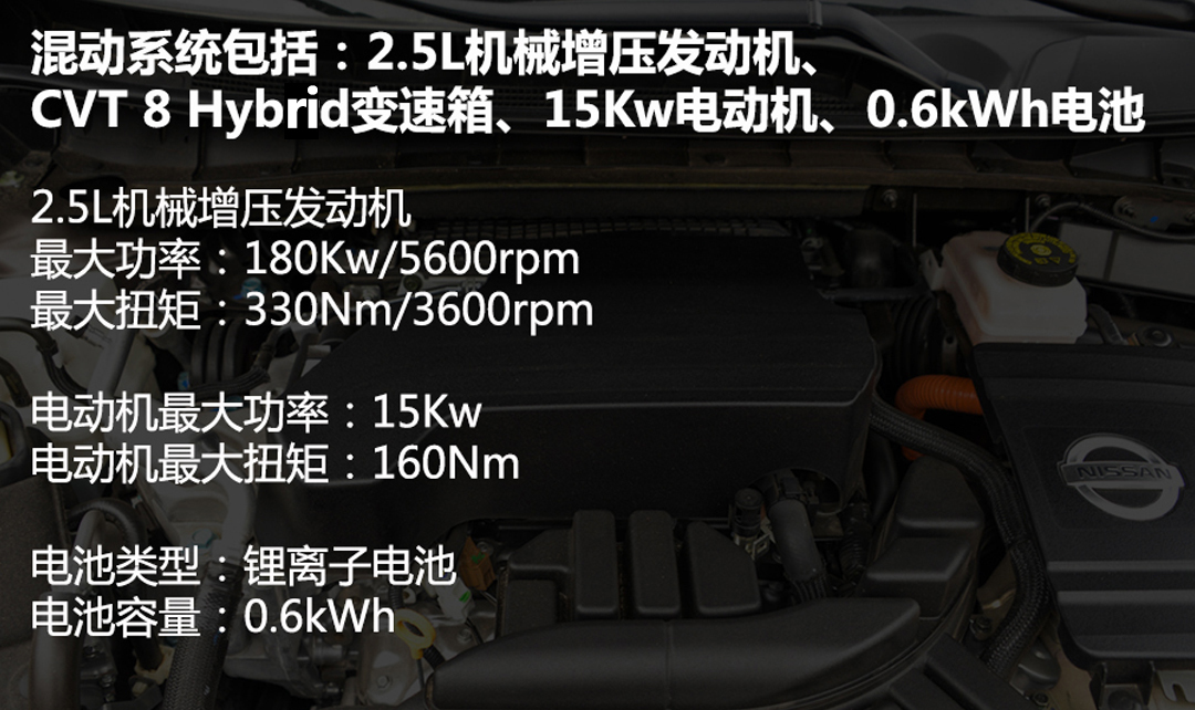 相比丰田君和本田桑的黑科技,同样来自日系的日产则要简单多了。它们为楼兰上加装了一台只有15KW,最大扭矩160N•m的小功率电动机。基本上它的能耐充其量也就起步刹那用一下,随后15kw的极限很快到来。(160N•m虽说不小,但也不会带来什么加速度)