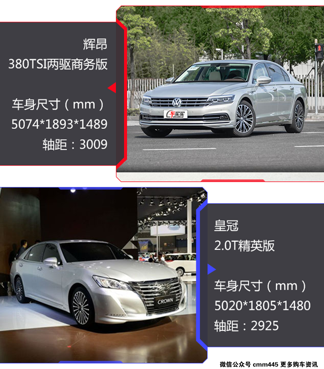 既然如此,这次我们就拿作为入门级的大众辉昂380TSI两驱商务版和丰田皇冠2.0T精英版对比一下,看看事实到底如何?