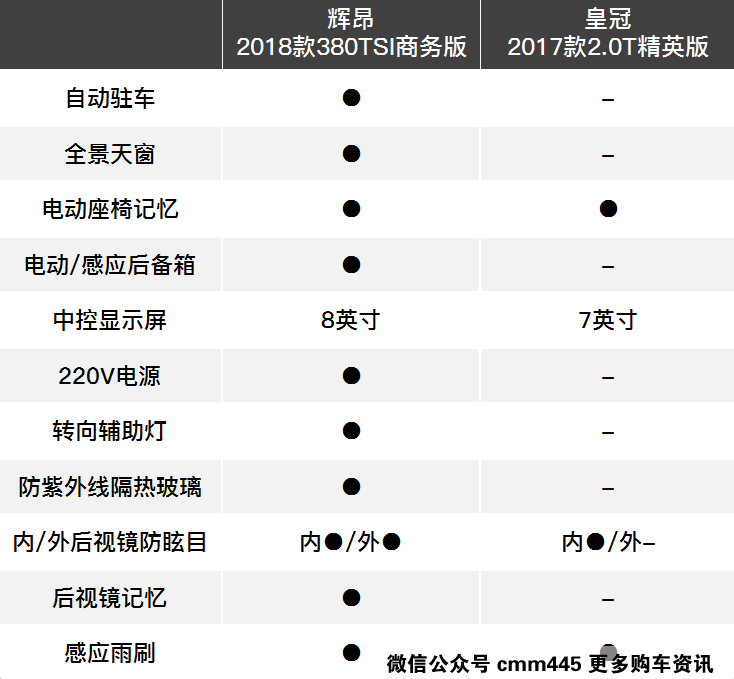 从对比表格当中不难看出,作为入门级的大众辉昂380TSI两驱商务版(34.9万)的配置并不会比丰田皇冠2.0T精英版(33.98万)少,甚至还多出了全景天窗、自动驻车、电动后备厢盖等等配置,都是能提升车档次感的东西,这个级别的车,有这些肯定比没有好。而且再综合外观尺寸、造型和乘坐质感等等方面来看,辉昂的优势就更加明显了。
