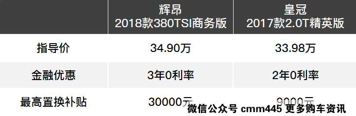 售价方面,辉昂2018款380TSI两驱商务版指导价比皇冠2017款2.0T精英版稍高,但辉昂给出的金融优惠政策和置换补贴都有力地降低了辉昂的购入门槛。我们不妨按首付3成来计算一下,34.9万元的商务版辉昂首付10.47万元,免息贷款期限36个月,月供仅为6786元。