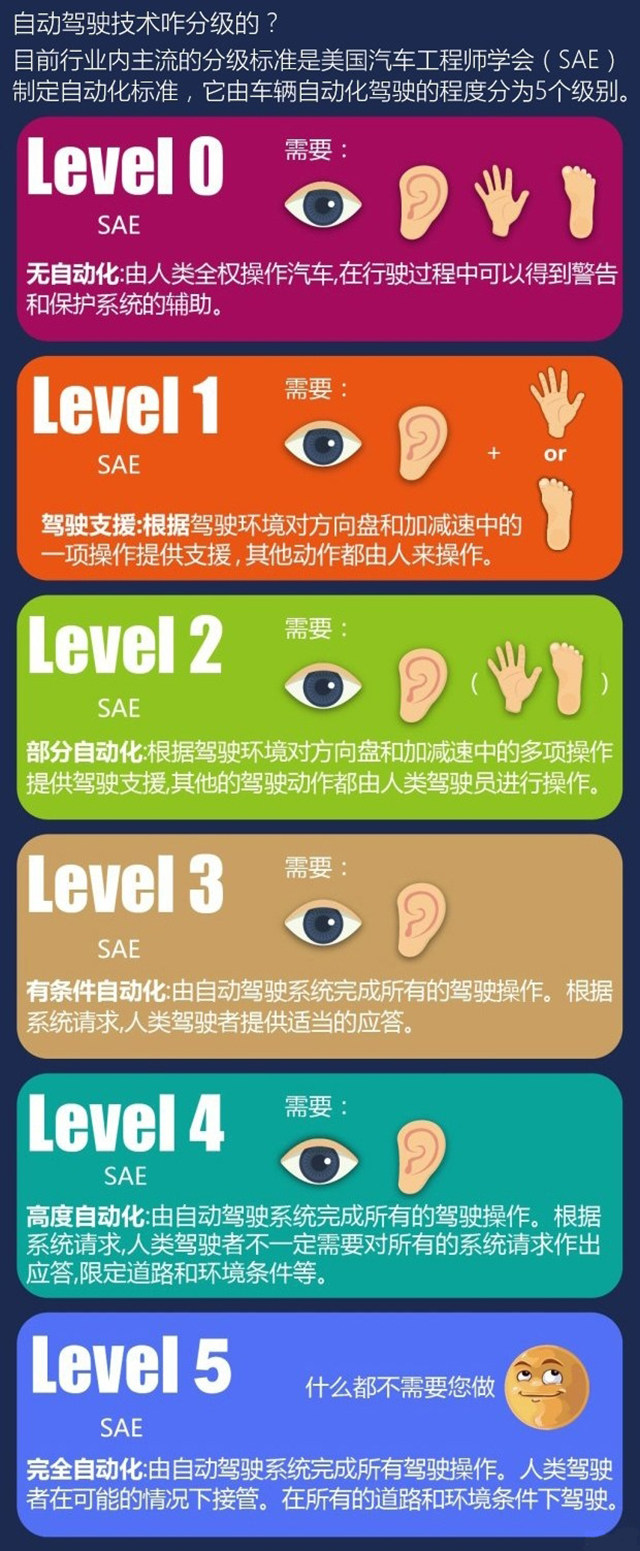 从汽车生产出来那一刻,就背负着方便人类出行的使命。从最早的定速巡航,然后到自适应巡航,最后再到今天所说的自动驾驶,整个过程发展神速。另外,谷歌、沃尔沃、福特等多家企业已宣称,2020年后将会实现Level 4级别部分自动驾驶汽车量产,当然这也需要有一套明确的法律来约束和引导这项技术的落地,希望能真正造福人类,把出行方式再创完美。