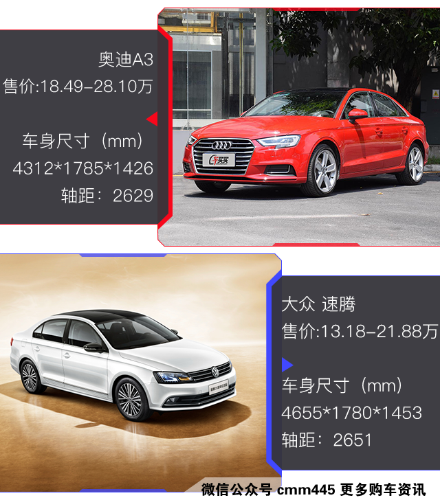 关注汽车开发理念的消费者都知道,A3和速腾共享的是集团下面的MQB平台,因此二者的诸多技术都是相通的,比如二者的动力系统均为EA211系列,采用的都是7挡双离合变速箱(1.4T车型)。但值得注意的是,奥迪A3的整体尺寸都比速腾小,价格又普遍贵5万元以上,难道这5万元只值多出来的3个圈圈吗?