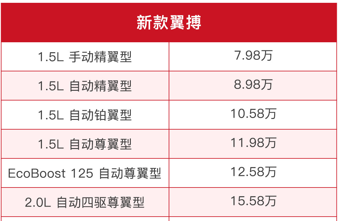 翼搏这次改款一共推出6个车型,价格从7.98万元到15.58万元,相比于老款选择的余地更多。由于低配车型仅售7.98万元起,完全打破了以往合资小型SUV的价格格局,直接把价格下探到自主品牌当中,这样的定价策略相信对于一些预算有限的年轻人来说,拥有合资小型SUV变得不再是奢望。