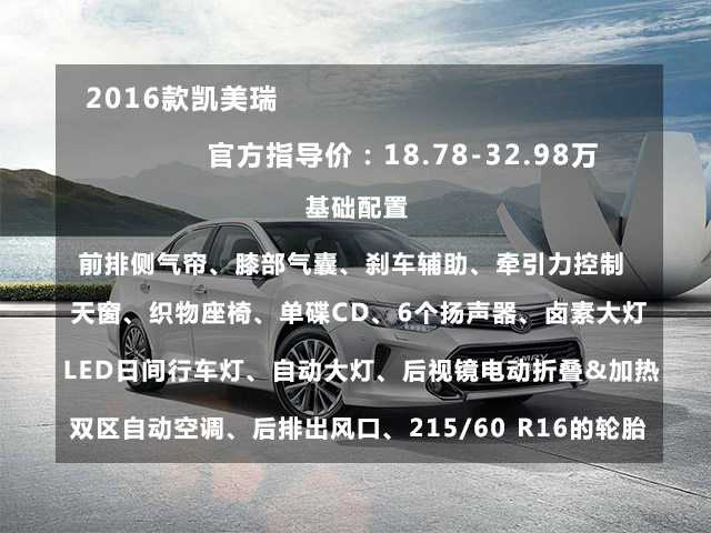 作为最低配入门版车型,厂家为它配上了:主/副驾驶气囊、前排侧气帘、膝部气囊、EBD、ESP、刹车辅助、牵引力控制、发动机启停、天窗、多功能方向盘、织物座椅、前/后排中央扶手及杯架、单碟CD、6个扬声器、卤素大灯、LED日间行车灯、自动大灯、主驾驶车窗一键升降(防夹手)、隔热玻璃、后视镜电动折叠&加热、双区自动空调、后排出风口、215/60 R16的轮胎。在配置上可以看到了厂家的诚意和良心。虽说挺好,但要是肯多掏几千块钱选择领先版,得到的绝不只是上升一个级别。