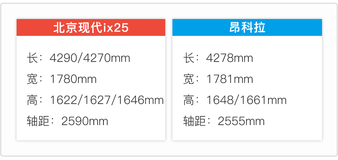 新款现代ix25的长度、宽度均有所增加,虽然高度不及昂科拉,但轴距更占优势,而这在实际空间体验上也有所体现: