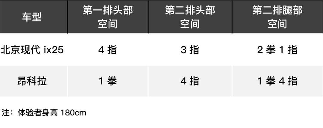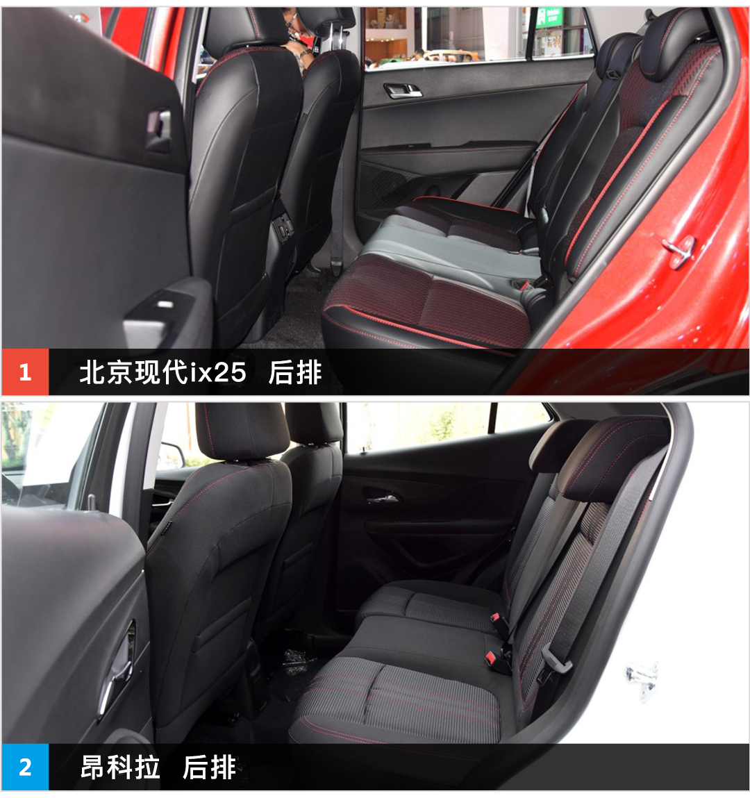 昂科拉的头部空间相比现代ix25要更充裕,而后者则能给后排乘客提供更大的腿部空间。乘坐空间虽然够用,但是两车都未配备中央头枕,且中央地板的凸起都较大,给中间乘客的舒适性造成一定的影响。