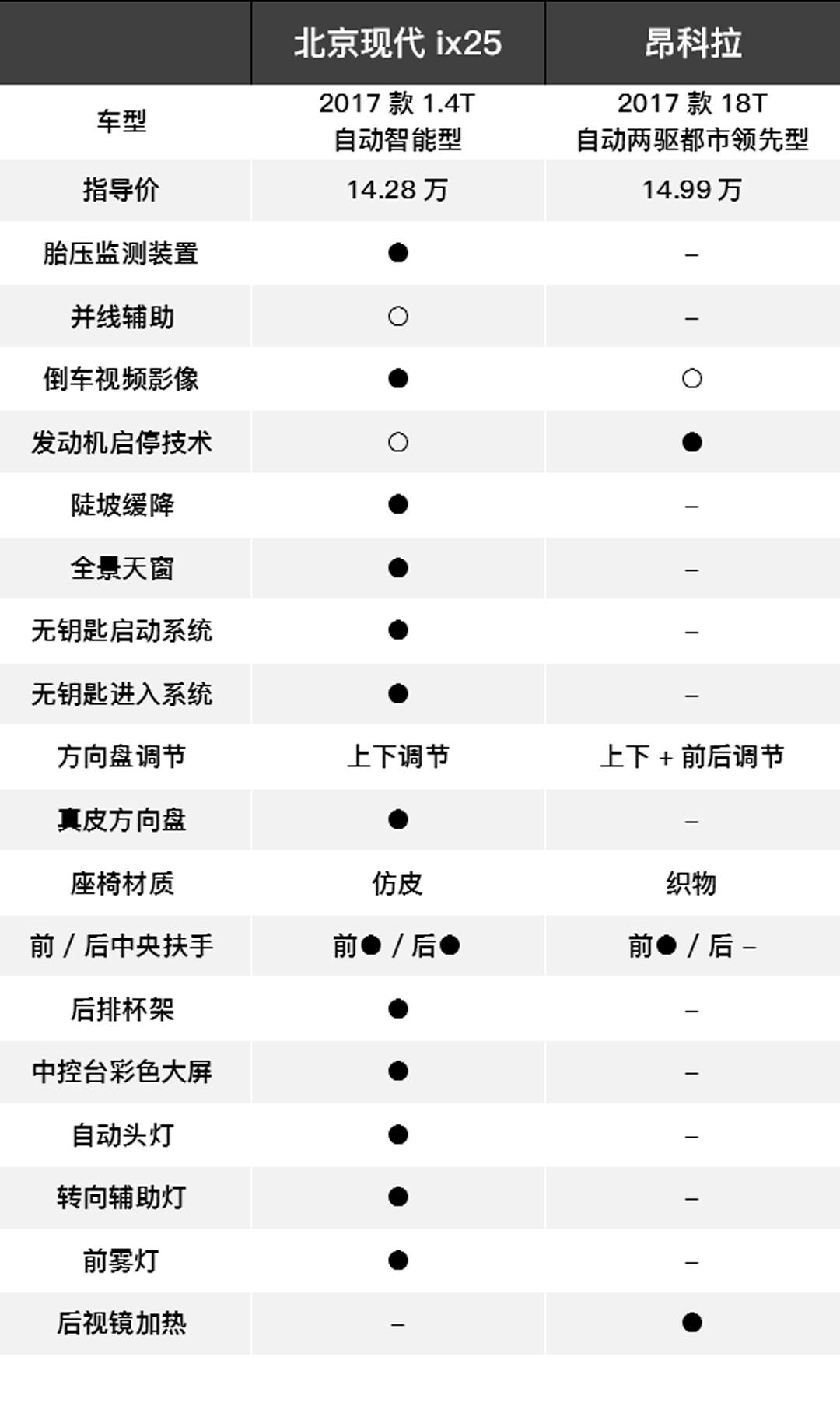 小雅在两车中分别选取指导价同为14万多的1.4T车型做对比,上表我们可以看出昂科拉除了在发动机启停技术、方向盘调节、后视镜加热这三项配置上处于上风之外,其他配置均不占优势。