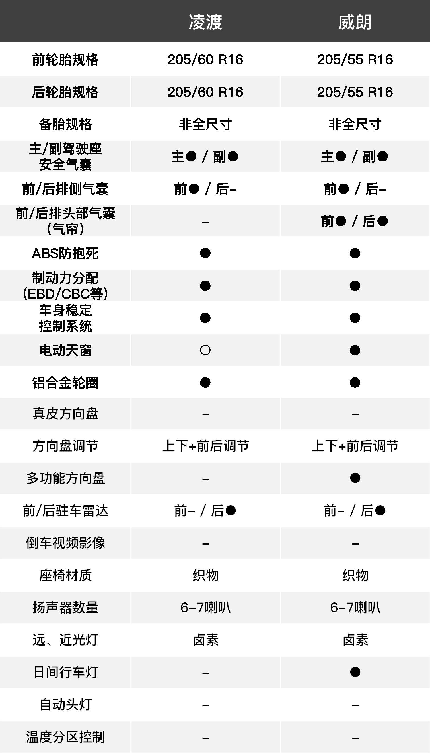 作为A+级的凌渡和威朗,配置明显比一般的A级合资轿车要更好。以两车全系标配的配置进行对比,尽管威朗的指导价比凌渡的更低,但配置却比凌渡多出了电动天窗,后排侧气帘,前后排头部气囊(气帘),多功能方向盘,日间行车灯。所以,威朗在配置上的优势很明显。