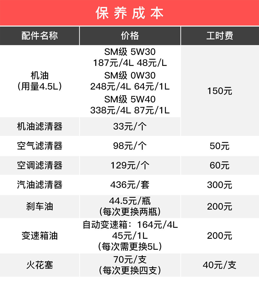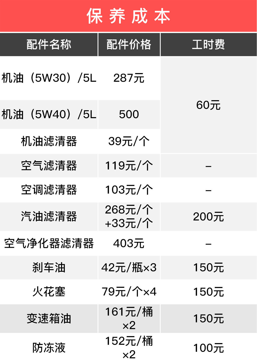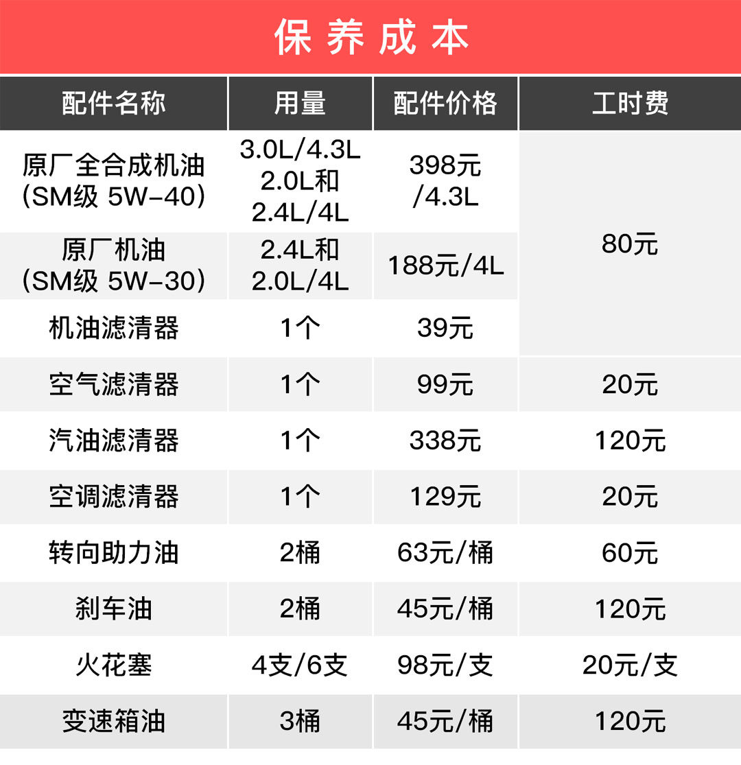 由于凯美瑞提供了两种不同价钱的机油,所以按照最便宜的小保养价格来进行计算,与思铂睿的价格相差不多。在工时费方面,在更换汽油滤清器、刹车油、变速箱油、火花塞、防冻液配件时,所需的工时费比较贵。