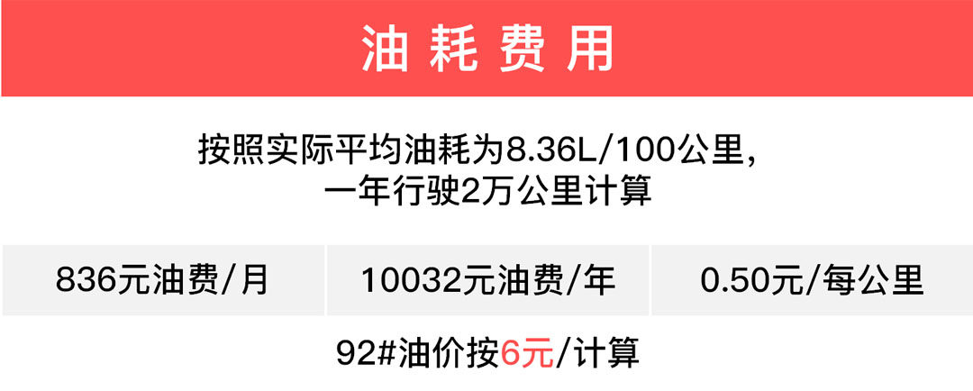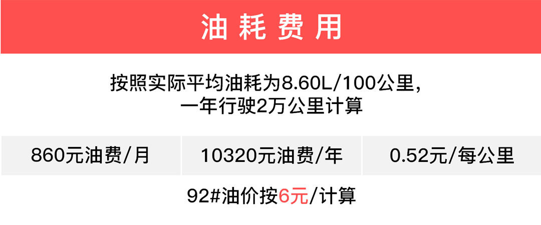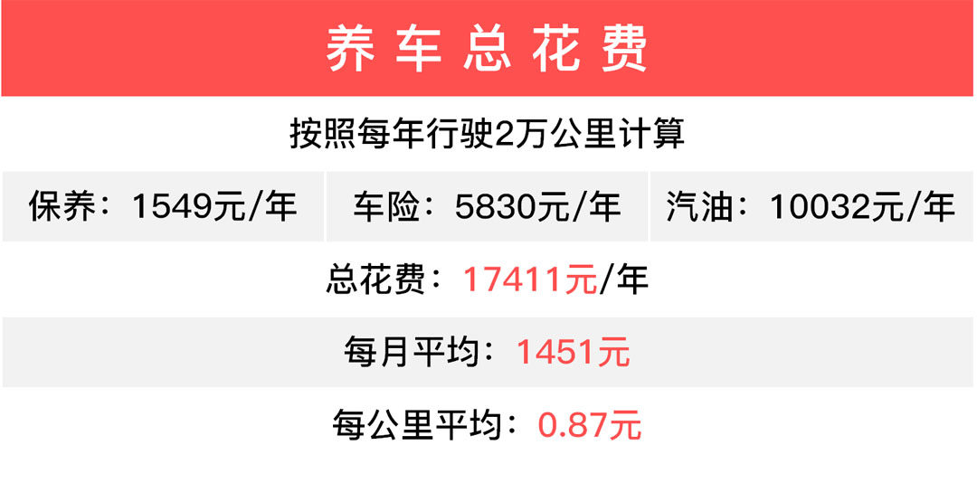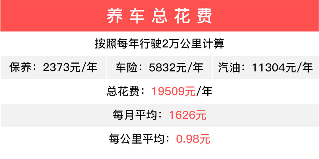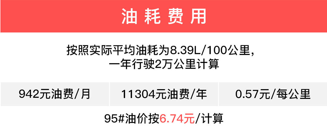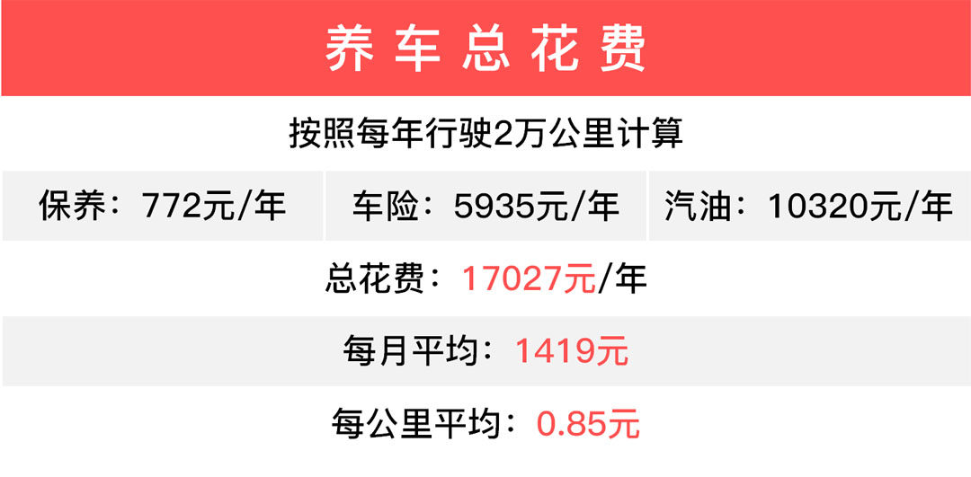 在油耗方面,每公里只需要0.57元的油耗表现还是能够让人接受,按照一年行驶两万公里进行计算,每个月在油耗上的花费仅需942元。