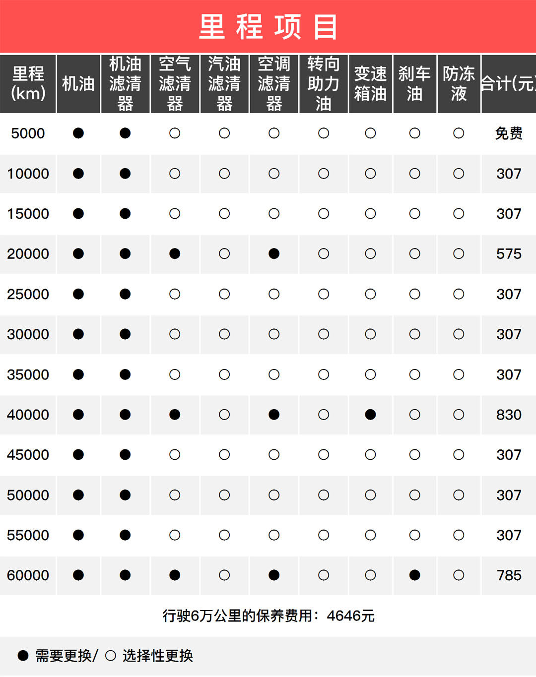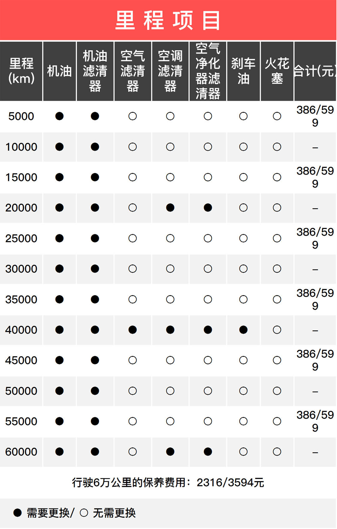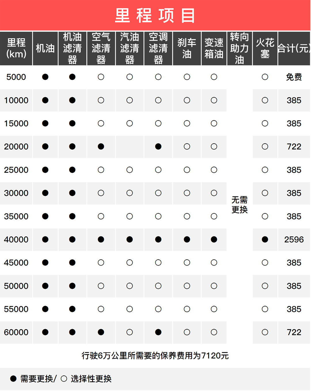 从图表上看,我们可以非常清楚地了解到思铂睿的小保养费用为385元,当行驶里程到达四万公里后,需要进行一个大保养,费用在2596元,其中主要是的费用来源于工时费。
