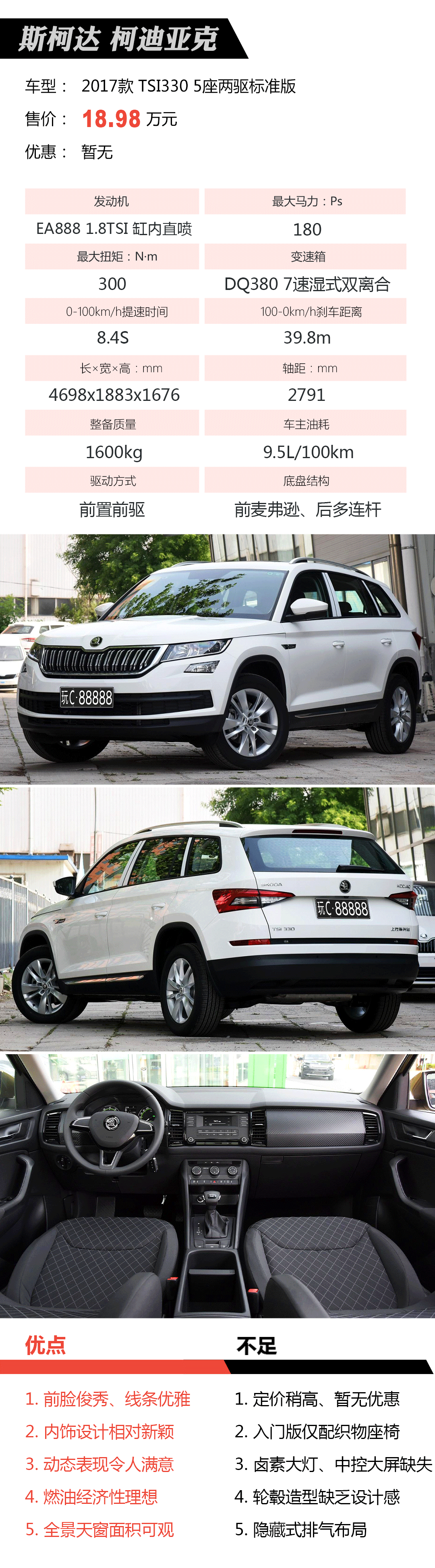 英气的前脸,让柯迪亚克跃身斯柯达SUV的颜值担当,空间、动力、油耗均未见明显短板,综合素质喜人的柯迪亚克不失为合资中型SUV的佳选。2.0T四驱7座车型更是交出0-100km/h加速时间6.8s、100-0km/h刹车距离37m的出色答卷,傲视同级对手。