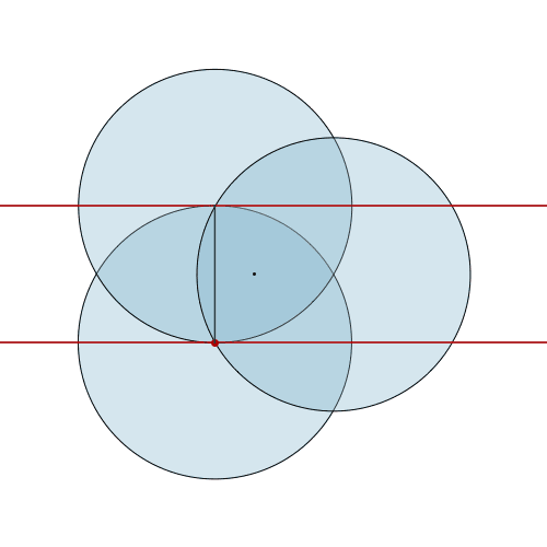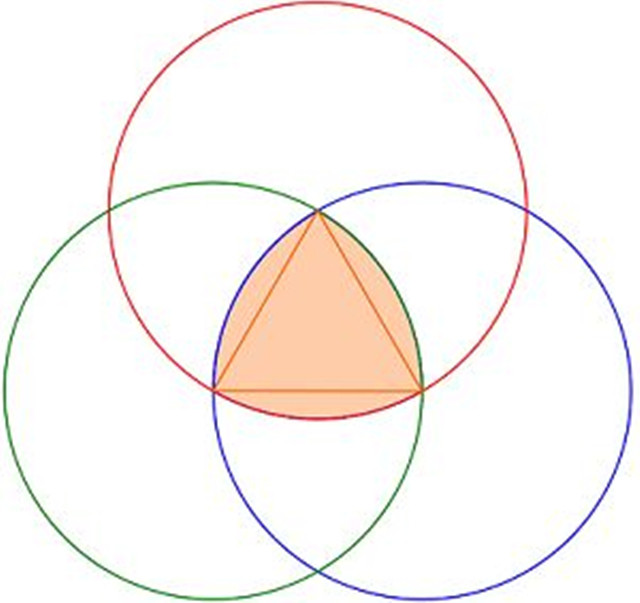 三角转子发动机本来叫汪克尔发动机,脑洞来自数学家发现的勒洛三角形,像下图这样把 3 个等半径的圆重合起来,两两互相经过圆心,3个圆相交的部分就是勒洛三角形,或者其发现者所称的“曲边三角形”。