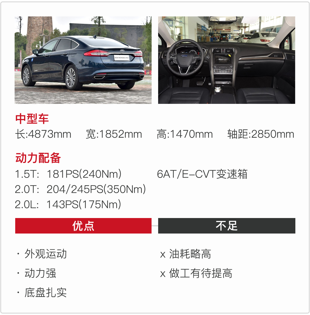 蒙迪欧一向以运动为卖点,动力不会差,1.5T车型的动力已经很不错,最大马力181PS,已经可以傲视同级车型。如果不满足的话还有2.0T高低功率两个选择,现在也加入了混动版的选择。蒙迪欧的驾驶质感不错,底盘很有韧性,既有美系车的舒适,也兼顾了运动性,操控性能不错,跟蒙迪欧运动的外观很搭。