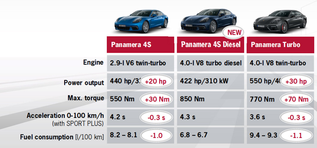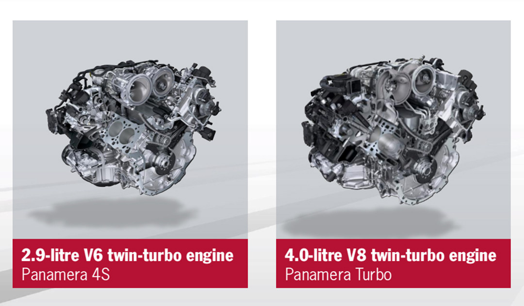 引擎部分是本次Panamera换代较大的改变之一。和上一代一样,Panamera继续提供V6和V8两个汽油机选择。全新的4.0L V8双涡轮增压发动机和2.9L V6双涡轮增压发动机分别代替了原来的4.8T V8和3.0T V6。表面上看只是简单降低排量,不过实际上整副引擎为保时捷首次采用模块化设计。