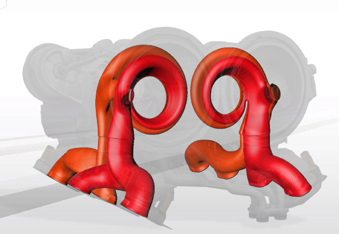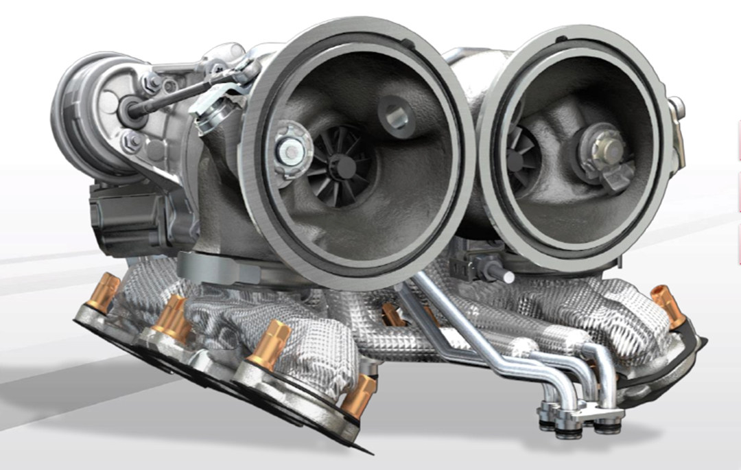更紧凑的高硅铝铸造缸体得以降低重量和改善重量平衡之余,采用排气歧管顶置的设计(一部分排气歧管整合入缸盖部分),两颗双涡管涡轮增压器分别服务两则的直列汽缸。相比一般排气侧出的设计,除了结构更紧凑以外,更短的排气芭蕉可以让废气以更短的路径推动废气涡轮,降低排气压力和温度的损失,从而提升涡轮的效率和反应。两侧的独立进气管路也能够减少两侧气流的互相干扰而提升进气效率。