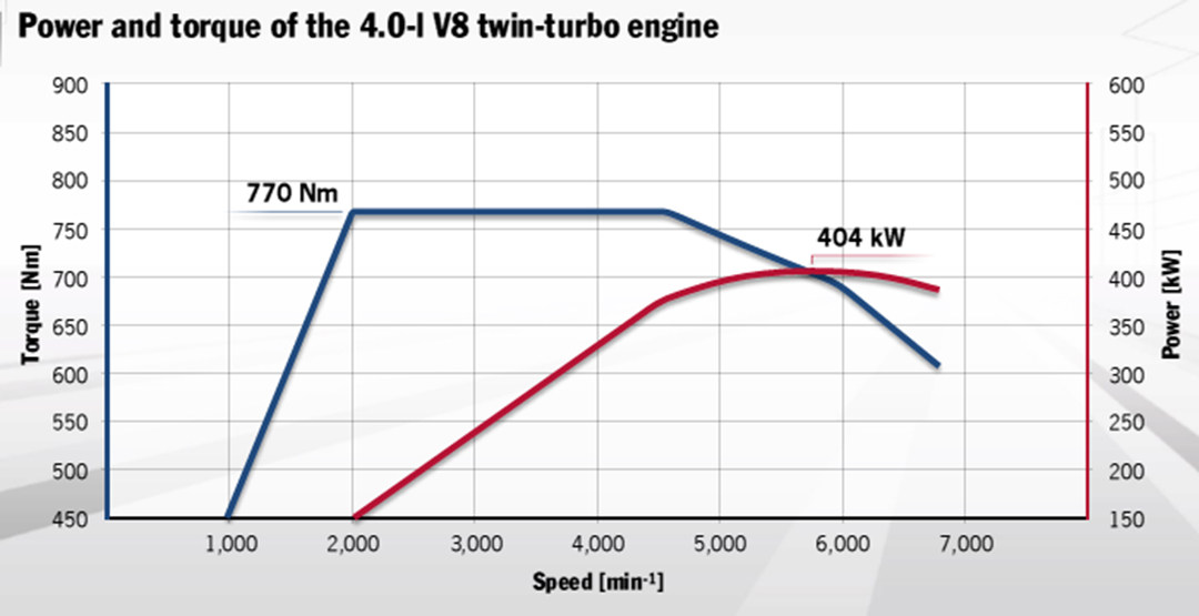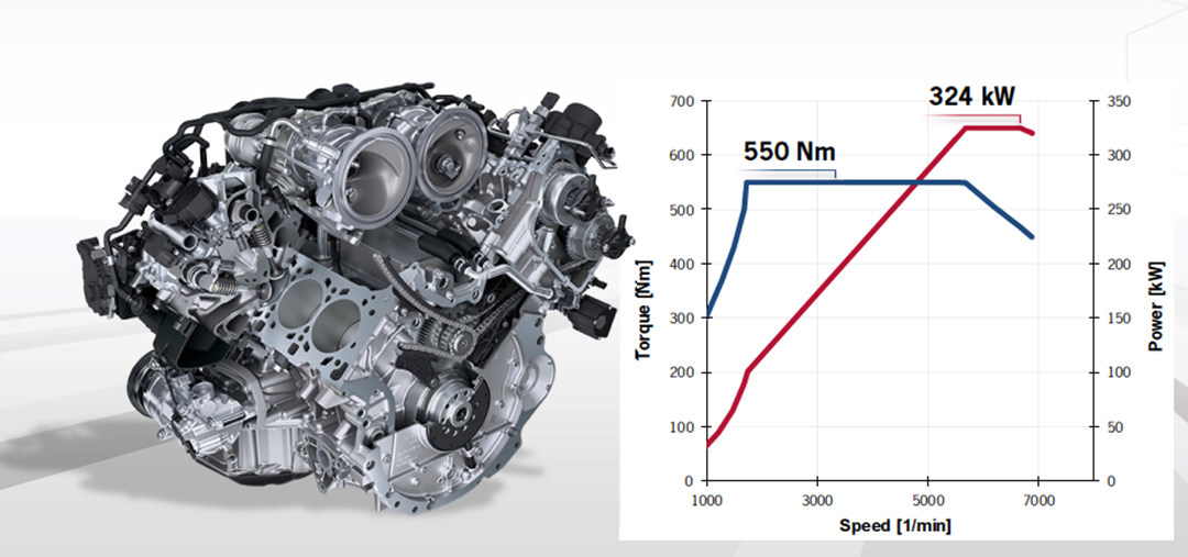 为了弥补引擎排气量降低造成的出力下降的缺点,引擎设计采用了大缸径短冲程设计,同时采用封闭水道,提高刚性以应付更高增压值的压榨,来提升马力扭力输出水平。新的V8引擎输出550匹最大马力和770牛米扭矩,比上一代V8引擎分别提升30匹马力和7公斤米扭力。V6引擎则输出440匹最大马力和550牛米扭矩,比上一代V6引擎微涨20匹和30牛米扭矩。两副引擎的扭矩均在2000rpm左右就达到最大并呈现平原式输出,直到接近5000rpm才开始出现衰退,对于日常行使来说有相当大的便利。