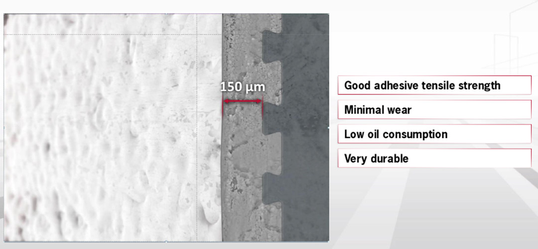除了提升性能以外,提升燃效也是这一代引擎的重要开发重点。首先铝制气缸里面采用了厚度约150微米左右的铁涂层,最大的好处就是将本来铝制缸体引擎需要使用的钢制缸套去掉,同时也能保证气缸壁的刚性和耐磨性。这样气缸间距可以做得更厚以提升刚性,发动机本体长度缩也能降低重量。活塞所使用的亚硝酸铬涂层活塞环将摩擦降低1/5,降低活塞运动的能量损失。