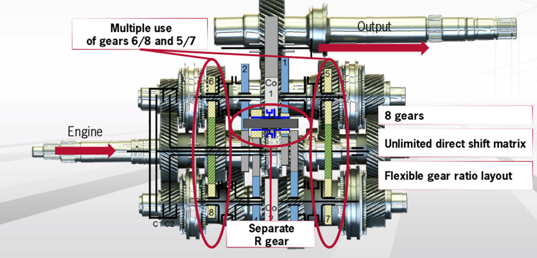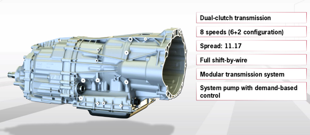 整颗变速箱为重新设计,从7前速的双轴结构变成4轴结构,整个变速箱比上一代产品缩短142mm,结构更紧凑之余,也降低了28%的变速箱内部损耗,传输效率提高。