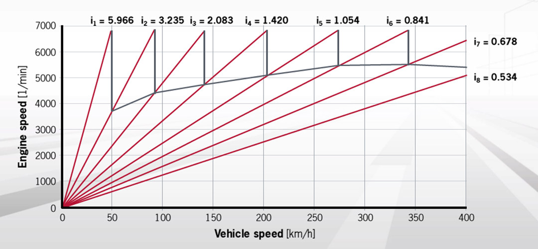至于新增加的8挡和7挡一样同属超比挡,6挡能够比7、8挡跑到更高的极速。不过使用第8挡在国内最高限速的120公里/小时时,引擎理论转速仅仅为1300rpm左右,结合闭缸技术,高速油耗有望进一步降低。