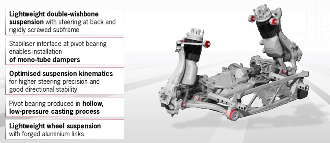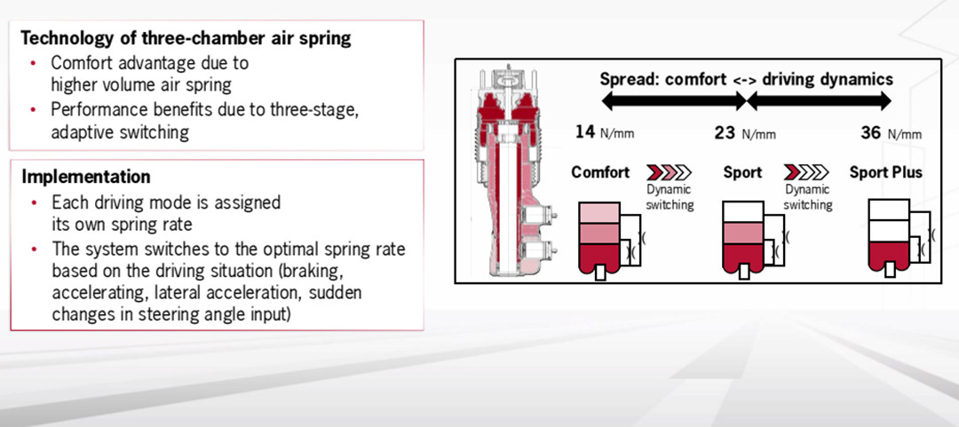 和上一代一样,气动弹簧代替了常规的金属弹簧,三层的气囊内其气体容量比上一代增加60%。更大容量的气体相比之前的气囊弹簧提升了在高频率运动下弹性系数的稳定性。同时能够因应不同的形式模式和状况,通过充入不同分量的空气改变内部气压,从而改变气囊弹簧的硬度。这就能够更智能的控制车辆的重心转移,和更精确的控制行驶趋势,也能同时满足极限驾驶和舒适需求之间差异较大的悬挂设定取向。