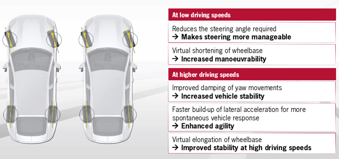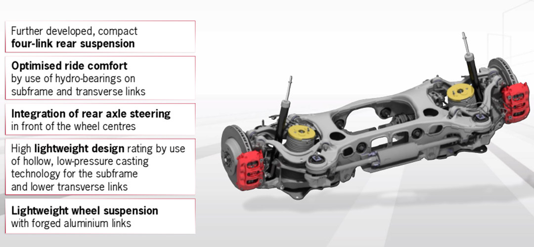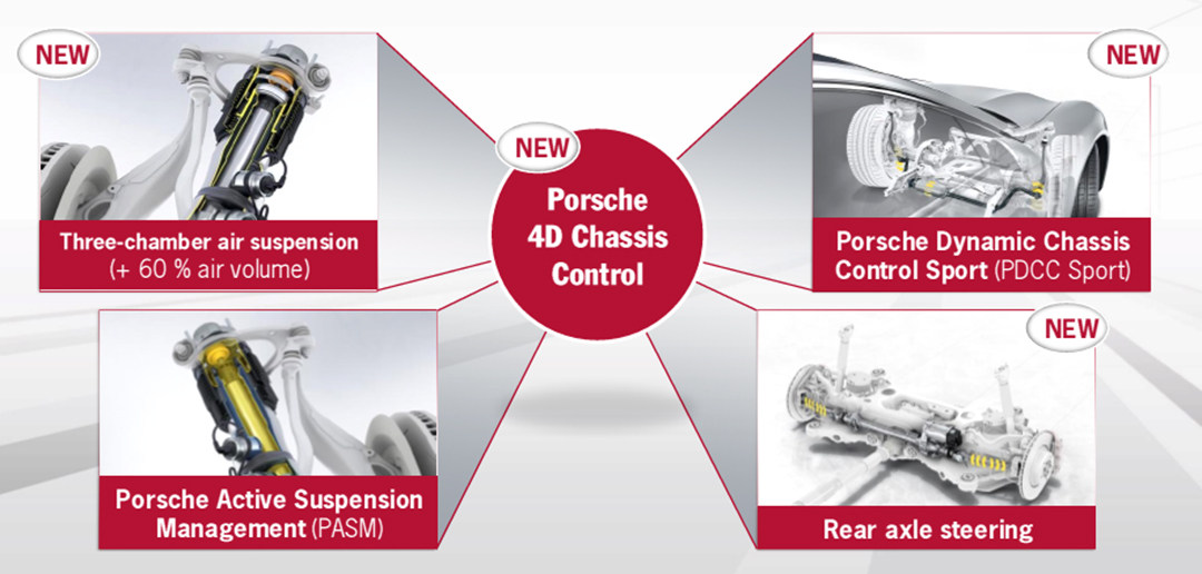 在新一代Panamera上,这套被命名为4D底盘控制系统由可变气动弹簧、PASM主动悬挂管理系统、后桥主动式随动转向系统和主动底盘控制系统(PDCC)组成。