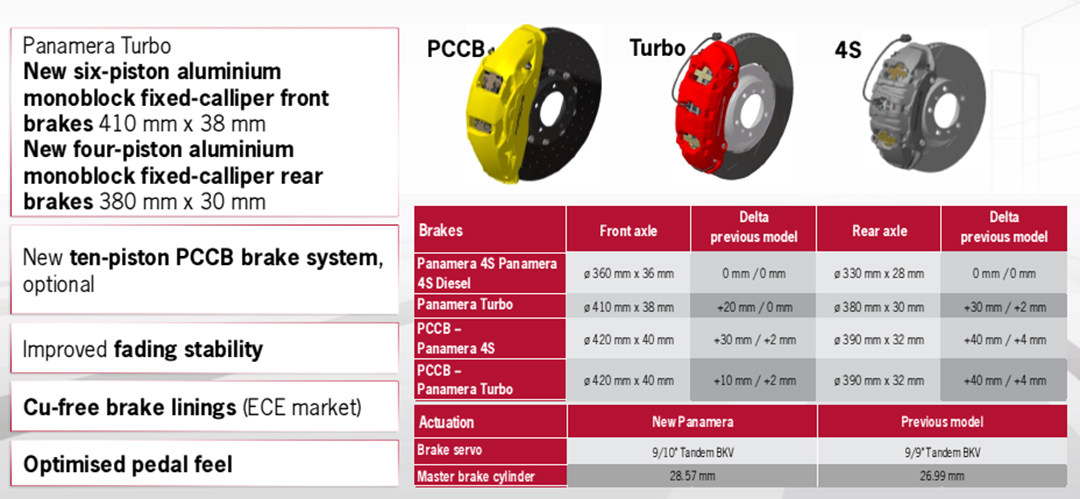 刹车系统也同样获得了提升。全新的前六活塞后四活塞铝合金一体锻造卡钳配前410mm后380mm刹车盘给Panamera这台重型四门房车提供线性且强劲的刹车力。相比之前的型号,前刹车碟直径增大10-30mm,后刹车底盘增大30-40mm。除了碟盘增大以外,刹车卡钳内的活塞直径也从26.99mm增大至28.57mm,提供更大的刹车压力。同时助力泵的尺寸也更大,能够短时间供应的制动液给予刹车,让刹车更灵敏和有效。值得一提的是,Panamera终于加入了10活塞高性能碳陶刹车系统PCCB(保时捷陶瓷复合制动系统 )作为选配。这套一般用于911和918等跑车上的高性能制动系统能够有更强的制动力,更佳的抗热衰退性和更轻的质量,提升制动力和稳定性以外,还能提升操控反应,称为保时捷最强刹车也不为过。